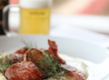 Descrição do Prato: File mignon suíno grelhado acompanhado de purê de batata cremoso, finalizado com redução de balsâmico e presunto de Parma